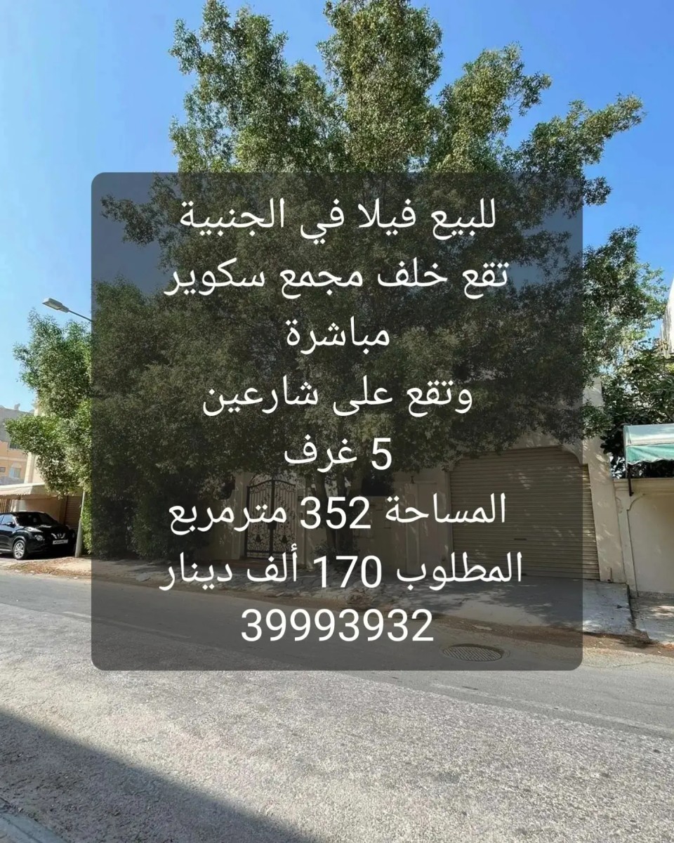 للبيع فيلا في الجنبية تقع خلف مجمع سكوير مباشرة تتكون من دورين وتقع على شارعين 5 غرف و 5 حمامات 3 صالات ومطبخ كبير وملحق خادمة وملحق سائق وكراج الى سيارتين وحديقة المساحة 352 مترمربع المطلوب 170 ألف دينار 39993932 عبدالفتاح حسن مسار المستقبل للعقارات مطلوب جميع العقارات من المالك مباشرة. https://instagram.com/masar.bh?igshid=MGU3ZTQzNzY=