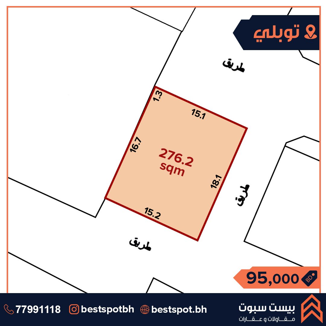 للبيع أرض في موقع مميز في منطقة توبلي مساحة الارض 276.2 متر مربع السعر الاجمالي 95.0 ألف دينار التصنيف سكني RAH Ref No. SLBS0101 للإستفسار والتواصل : 38991112 38991110 للمزيد من العقارات: @bestspotbh @bah_property #Bestspotbh_lands #bahrain_property #bahrainrealestate #عقارات_البحرين #اراضي