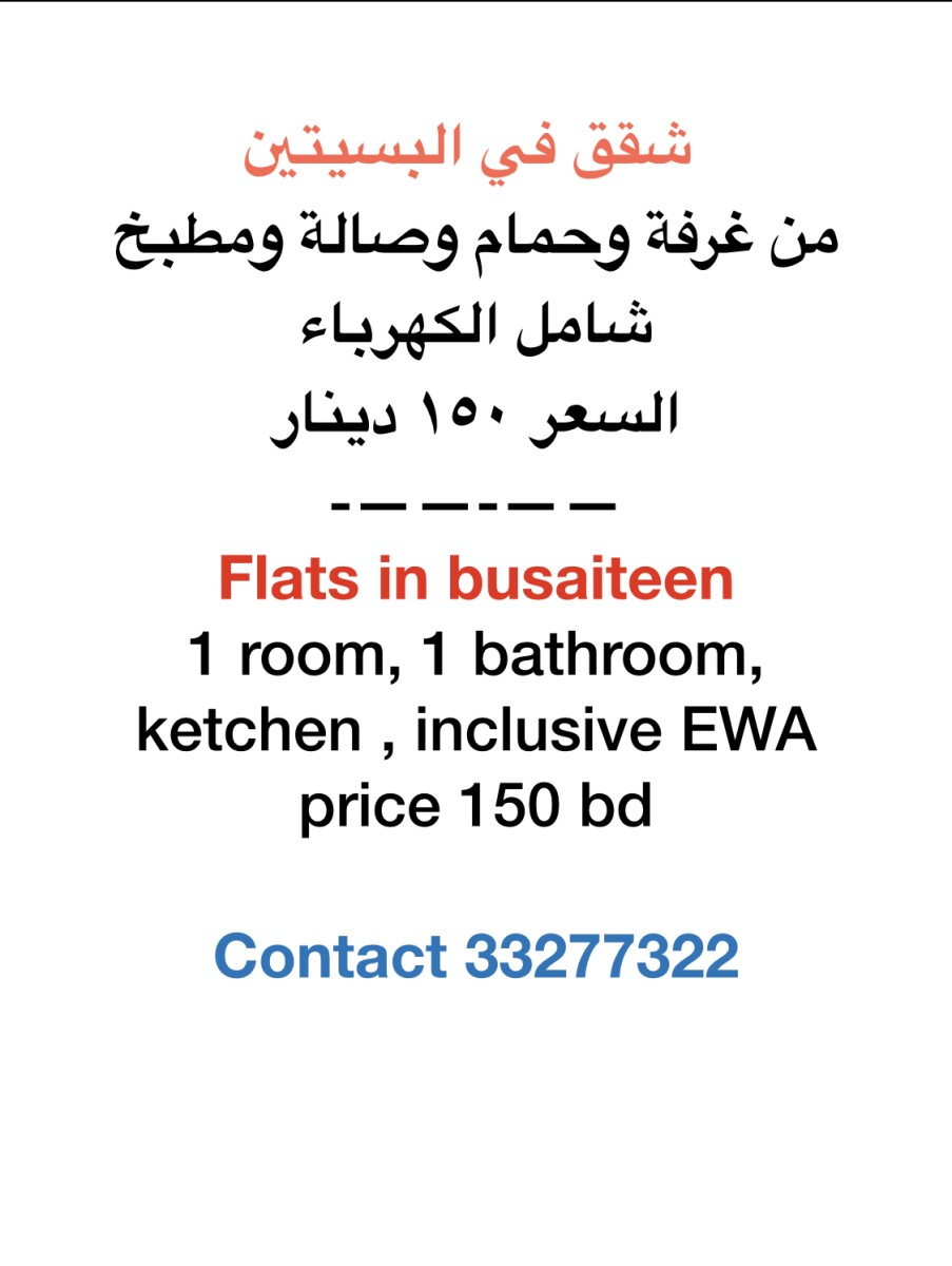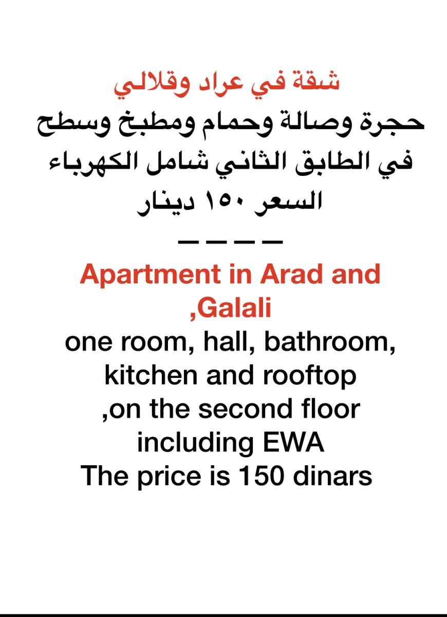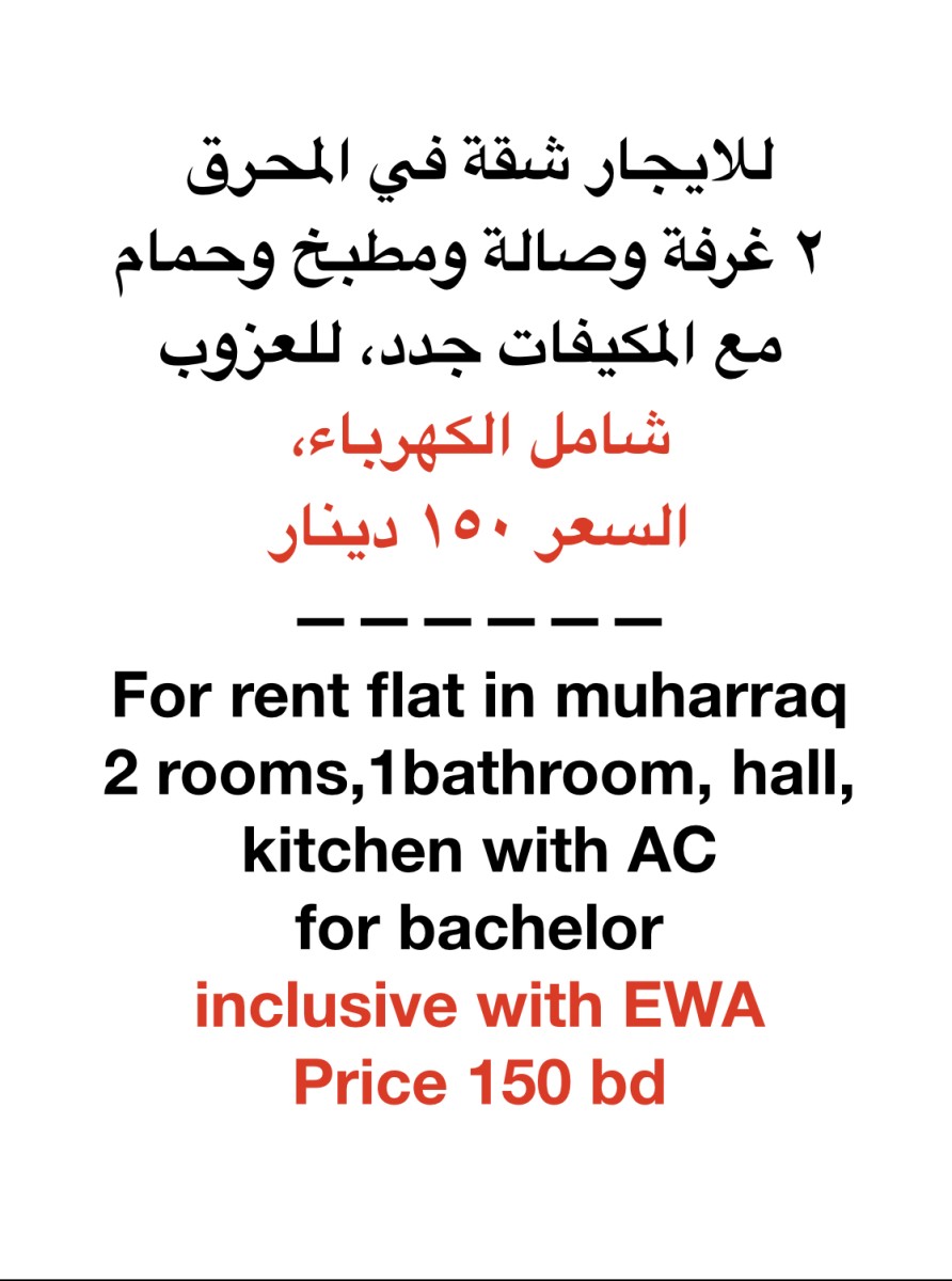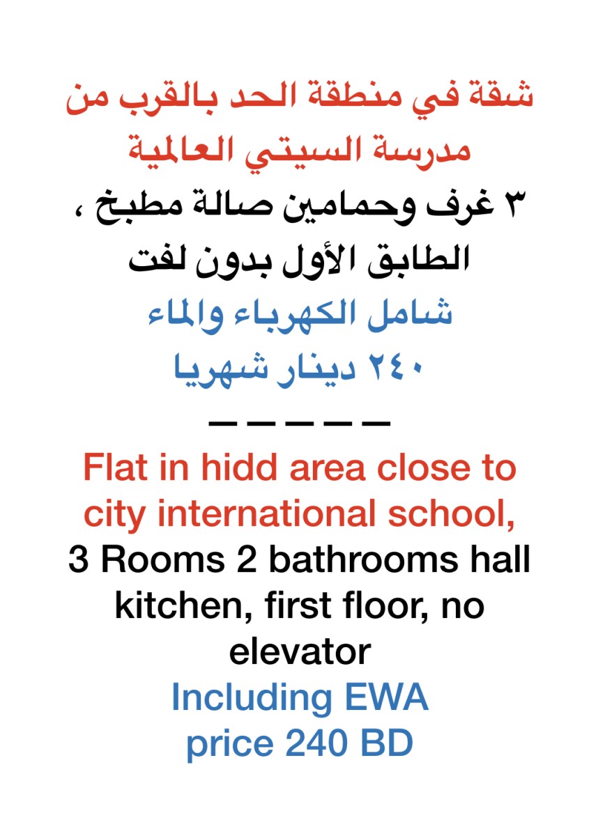 شقة في منطقة الحد بالقرب من مدرسة السيتي العالمية ٣ غرف وحمامين صالة مطبخ ، الطابق الأول بدون لفت شامل الكهرباء والماء ٢٤٠ دينار شهريا ————— Flat in hidd area close to city international school, 3 Rooms 2 bathrooms hall kitchen, first floor, no elevator Including EWA price 240 BD