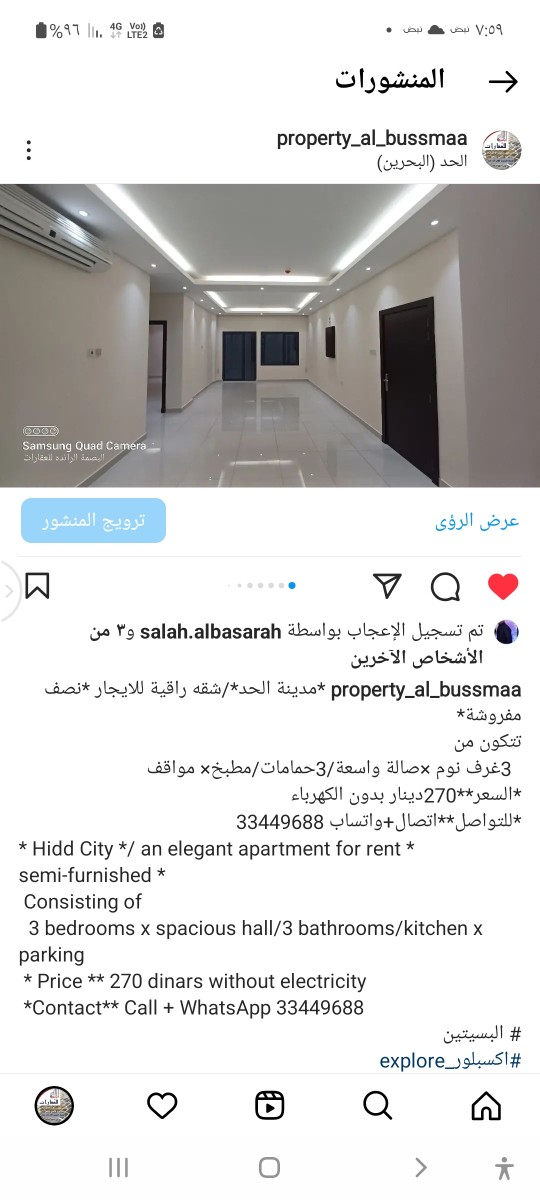 للايجار شقه دور أرضي في الحد مكونة ٢غرف ٢حمامات صاله ومطبخ سعر الايجار ١٩٠ دينار شامل الكهرباء والماء للتواصل مركز عين البحرين العقاري (وكيل مبيعات مرخص من قبل مؤسسة التنظيم العقاري) رخصه رقم (SA201803/0013) تلفون (34175099)