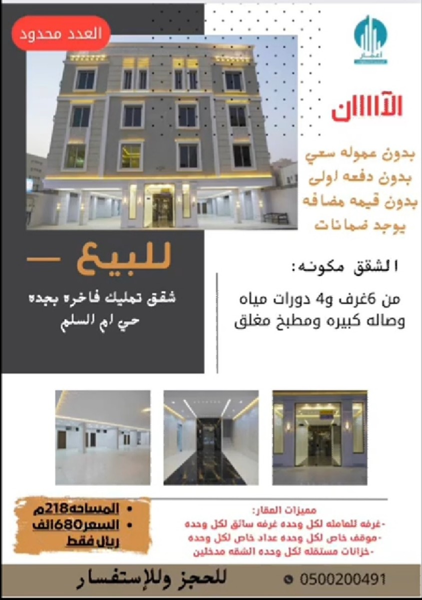 للبيع فلة مودرن في جدة مخطط الرياض ،،، رقم المعلن (1048311) مساحهـ الارض 312 � شارع بعرض 16 دورين و ملحق الدور الارضي : مجلس رجال + مغاسل ودورة مياة + مقلط + مجلس نساء + مغاسل ودورة مياة + مطبخ مع غرفة خادمة وخدماتها + غرفتين نوم تكيف شباك + غرفة نوم ماستر اسبليت الدور الثاني الشقة : غرفة نوم تكيف شباك + غرفة نوم تكيف اسبليت + دورة مياة ومغاسل مشتركة + صالة جلوس + مطبخ + مجلس + دورة مياة ومغاسل + سطح … الملحق : سطح … المميزات ✅. ——————————— غرفة سائق ✅. تكييف سبليت ✅. تكيف شباك ✅. موقف سيارة ✅. تأسيس مصعد ✅. السعر : 1,100,000