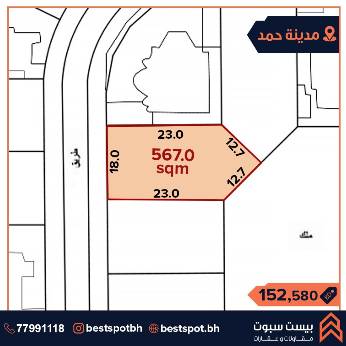 للبيع أرض في مدينة حمد على شارع امامي و خلفي الدوار 3 بالقرب من محطة البترول مقابل حديقة 55 المساحة 455.2 متر مربع المطلوب 120 ألف / كود A155