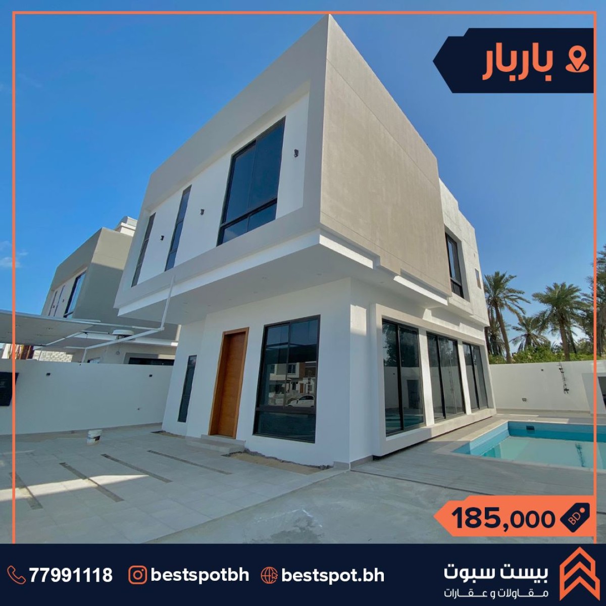 . للبيع فيلا راقية في منطقة مميزة في منطقة باربار بالقرب من اوكسجين جم. تتكون الفيلا من : صالتين 3 غرف نوم 5 حمامات مطبخ داخلي وخارجي غرفة خامة مع غرفة غسيل تحتوي الفيلا على: تكييف مركزي حديقة كبيرة بركة سباحة كراج لسيارتين مساحة الارض 301.4 متر مربع. مساحة البناء 270.0 متر مربع السعر 185.0 الف قابل للتفاوض. Ref No. SVAH042 للإستفسار والمعاينة: 38991113 للمزيد من العقارات : @Bestspotbh @Bestspotbh #Bestspotbh_Villas #bahrain_property #bahrainrealestate #فلل #باربار #عقارات_البحرين #للبيع #عقارات