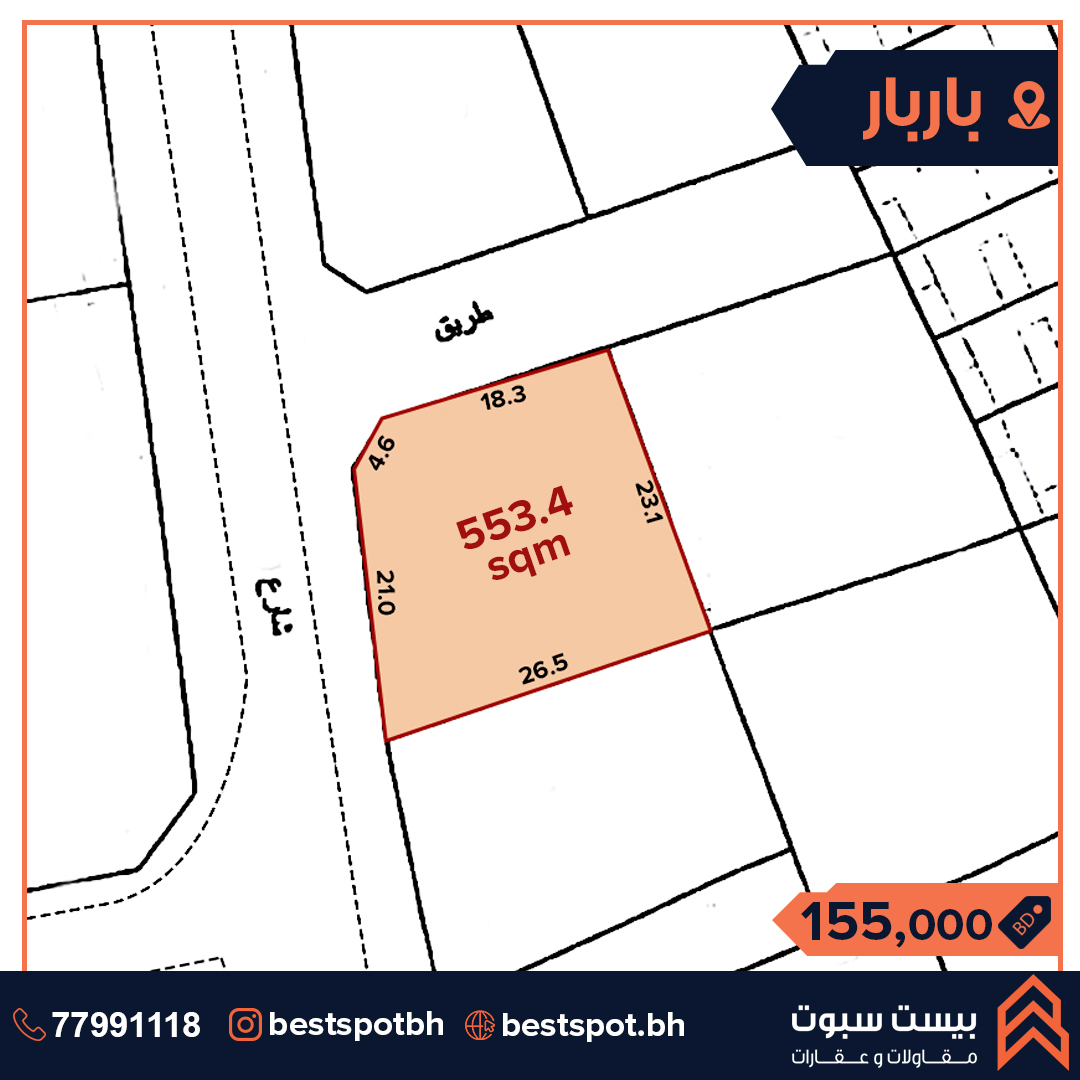 للبيع ارض على شارعين وزاوية في منطقة باربار مساحة الارض 553.4 متر مربع السعر الاجمالي 155.0 ألف دينار التصنيف سكني RA Ref No. SLBS0104 للإستفسار والتواصل : 38991112 38991110 للمزيد من العقارات: @bestspotbh @bah_property #Bestspotbh_lands #bahrain_property #bahrainrealestate #عقارات_البحرين #اراضي