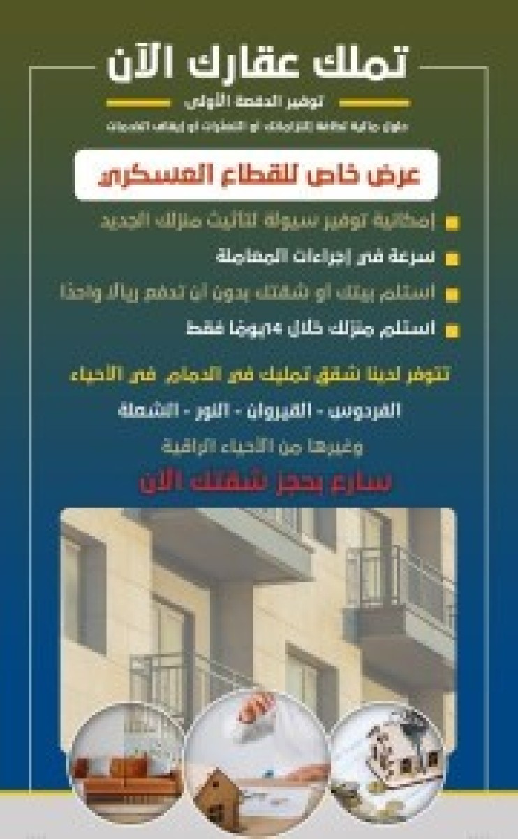 ⚪عرض رقم AZ1031⚪ ▪️ *6 شقق للبيع* ▫️ ▫️ *ملحق للبيع* ▪️ ▫️الدمام حي الشعله ▪️ ◼️مساحات الشقق 171◻️ *العماره بها مصعد* *علي الكود السعودي* • مواصفات كل شقه⬇️ •مدخل رجال •مجلس رجال بدوره مياه ومغاسل •مقلط •صاله •مطبخ •2 غرفه نوم مشترك •غرفه نوم ماستر بدوره مياه • دوره مياه •غرفه غسيل •مستودع *الملحق*? •مدخل رجال •مجلس رجال بدوره مياه ومغاسل •مقلط •صاله •مطبخ •2 غرفه نوم مشترك •غرفه نوم ماستر بدوره مياه • دوره مياه •غرفه خادمه بدره مياه خاصه •غرفه غسيل •سطح وسيع ? *السعر لكل شقه 585* ? ? *سعر الملحق680* ?