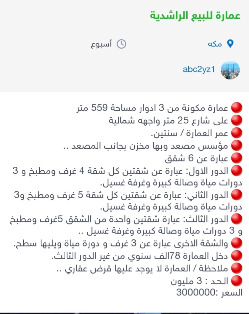 ? عمارة مكونة من 3 ادوار مساحة 559 متر ? على شارع 25 متر واجهه شمالية ? عمر العمارة / سنتين. ? مؤسس مصعد وبها مخزن بجانب المصعد .. ? عبارة عن 6 شقق ? الدور الاول: عبارة عن شقتين كل شقة 4 غرف ومطبخ و 3 دورات مياة وصالة كبيرة وغرفة غسيل. ? الدور الثاني: عبارة عن شقتين كل شقة 5 غرف ومطبخ و3 دورات مياة وصالة كبيرة وغرفة غسيل. ? الدور الثالث: عبارة شقتين واحدة من الشقق 5غرف ومطبخ و 3 دورات مياة وصالة كبيرة وغرفة غسيل .. ? والشقة الاخرى عبارة عن 3 غرف و دورة مياة ويليها سطح. ? دخل العمارة 78الف سنوي من غير الدور الثالث. ? ملاحظة / العمارة لا يوجد عليها قرض عقاري .. ? الـحـد : 3 مليون السعر :3000000